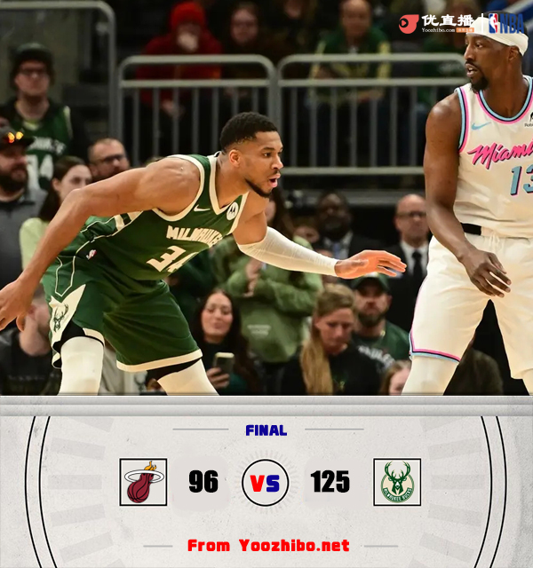 JRS低调看直播讯 1月24日讯 NBA常规赛,雄鹿客场挑战热火。雄鹿4连胜以24胜17负高居东部第4,热火21胜21负东部第9。本场比赛因天气原因被延迟1小时开赛,巴特勒被球队禁赛。一开场,雄鹿手感冰凉,热火打出13-3的攻势取得两位数领先,字母哥高效输出带队迅速迫近比分,次节雄鹿全面回暖,单节轰下44分净胜热火19分,利拉德1秒内连投带罚收获6分,半场战罢雄鹿71-55领先热火。下半场,双方命中率下降,得分都很困难,雄鹿率先回暖将分差拉开到20分以上,末节双方围绕20分的分差展开拉锯战,热火大势已去无力回天。最终,雄鹿125-96大胜热火,客场过关。
