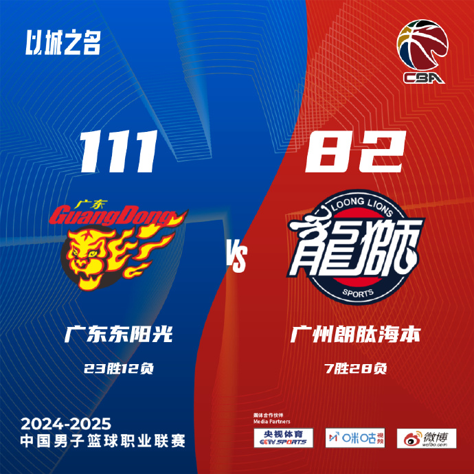 JRS低调看直播1月24日讯 CBA常规赛继续进行,广东主场迎来与广州的同省德比,郭艾伦此役缺阵,广州目前遭遇6连败,7胜27负排在联赛倒数第三,广东上场不敌上海,22胜12负位列第8位。首节开打后广州反客为主一度占优,莫兰德和任骏飞内线接连打进,广东稳住局势后来居上,首节结束时广东领先7分,次节回来,双方进攻稍显滞涩,贝兹利内外结合不断取分,广东稳扎稳打始终保持优势,麦考尔单节13分苦苦支撑,半场战罢,广东已经领先10分。易边再战后广州进攻依然没有起色,吉伦沃特联手任骏飞不断拉开比分,广东领先17分进入末节,末节上来,广州率先换上全部替补,双方分差越来越大,比赛提前失去悬念,最终广东111-82大胜送对手7连败。