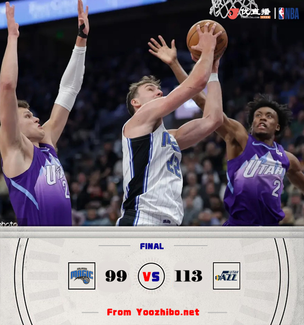 JRS低调看直播2月2日讯 NBA常规赛,爵士主场迎战魔术,爵士目前8连败后10胜36负西部垫底,魔术则是2连败后24胜25负排名东部第8。比赛开始,双方上来很是慢热,进攻端连续打铁,小瓦靠罚球止血,但爵士科林斯和凯斯勒接连送暴扣,马尔卡宁外线也接连发炮顺势拉开双位数领先,次节魔术进攻端继续不在状态,主力疯狂打铁,反倒是爵士多点开花扩大领先,席尔瓦抢断后压哨三分助队半场追到差12分。下半场,班凯罗进攻端还是铁,爵士抓住机会接连打成转换,一波8-0小高潮领先到20分以上,随后魔术接连罚球止血,三节魔术还落后16分,末节小瓦接连造杀伤罚球追分,但爵士总能回应一度又拉开20分以上领先,小瓦格纳里突外投单节砍下15分追分,但无奈分差太大,最终爵士113-99力克魔术,终止8连败同时送对手3连败。