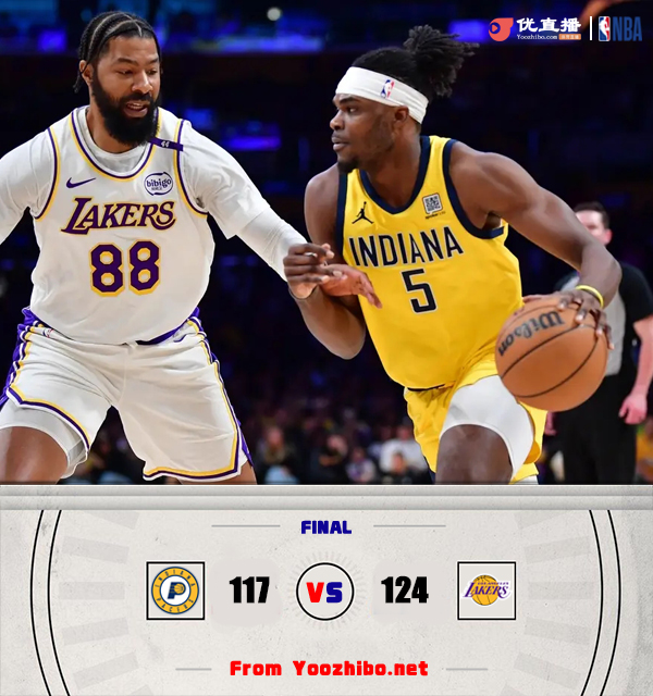 JRS低调看直播2月9日讯 NBA常规赛,湖人主场迎战步行者。近期湖人取得4连胜,以30胜19负稳居西部第5,步行者29胜21负东部第4。比赛开始,湖人率先发力,里夫斯高效发挥带队很快取得20分的领先,次节湖人命中率下降,步行者连投带罚稍稍缩小分差,半场战罢湖人66-50领先步行者。易边再战,步行者打出16-4追到只差4分,里夫斯和范德比尔特联手回敬15-4的攻击波稳住局势,末节里夫斯连得8分,步行者苦苦追赶无果。最终,湖人124-117击败步行者,取得5连胜。