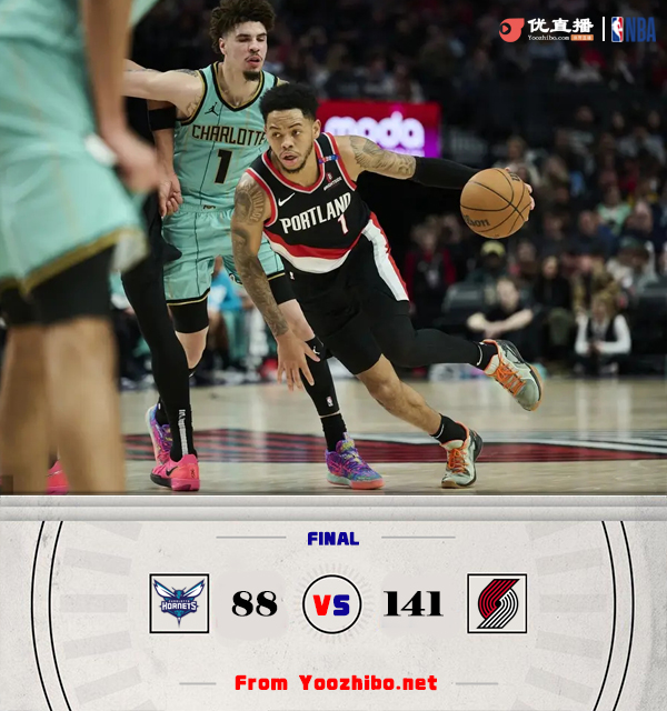 JRS低调看直播讯 北京时间2月23日讯 NBA常规赛,黄蜂对阵开拓者,黄蜂上场输给掘金,开拓者最近遭遇4连败,本场比赛艾顿和罗威都缺阵。开场没多久开拓者就在阿夫迪亚的带领下打出一波13-0的攻势建立领先,虽然黄蜂两记三分止血,但开拓者再度打出冲击力又将比分拉开,开拓者的外线也逐渐找到手感连中三分。第二节黄蜂进攻依旧打得不理想,鲍尔手感不佳,反观西蒙斯状态火热单节轰下15分帮助开拓者继续扩大优势,半场过后开拓者领先33分。易边再战,鲍尔的表现依旧不佳,开拓者则是全面开花将分差继续拉大,比赛彻底失去悬念,末节成为两队练兵时间,最终开拓者141-88血洗黄蜂结束4连败,黄蜂遭遇2连败了。
