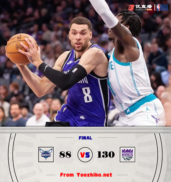 JRS低调看直播2月25日讯 NBA常规赛激战正酣,国王主场迎战黄蜂,两队上场均遭遇大败,国王目前28胜28负暂列西部第10,黄蜂14胜41负位列东部倒数第二。首节开打后布里奇斯连投带罚接连取分,黄蜂开局发力早早占优,拉文连中三分强势回应,国王稳扎稳打后来居上,首节结束时国王已经领先11分,次节回来,黄蜂进攻滞涩追分乏力,拉文手感依旧予取予求,德罗赞外线续上火力,半场战罢,国王确立20分优势。短暂休整后黄蜂突然发力回敬10-2小高潮,穆雷连投带补稳住局势,三节结束后国王依然领先16分,末节上来,拉文无人可挡再下三分雨,比赛分差过大提前失去悬念,最终国王130-88大胜对手。