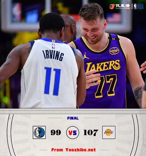 JRS低调看直播讯 北京时间2月26日讯 NBA常规赛焦点战,湖人主场迎战独行侠。这是东契奇和浓眉重磅交易后两队首次交锋,可惜浓眉本场因伤缺阵。湖人34胜21负西部第4,独行侠31胜27负西部第8。比赛开始,湖人率先发力打出9-2开局,欧文和东契奇接连外线对飚,随后里夫斯和八村塁又是接连三分命中,首节湖人领先8分,次节双方展开拉锯战,里夫斯接连三分单节得分上双,东契奇接连送助攻一度拉开16分领先,但湖人收内线策略效果不佳,克里斯蒂接连三分助独行侠半场追到差8分。下半场,双方展开拉锯战,湖人外线多个机会把握不住,欧文连砍7分继续带队追分,埃克萨姆接连中远投砍下5分追到差1分,末节克莱连续3记三分追平比分,东契奇上场和一攻一传助队稳住局势,欧文三分再追,但芬尼-史密斯和詹姆斯接连送补扣,湖人牢牢掌握住两球以上领先,最终湖人107-99力克独行侠,拿到3连胜。
