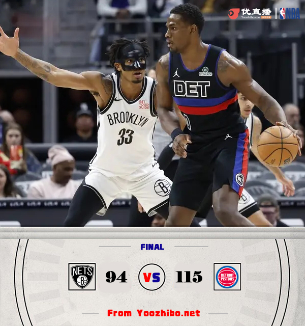 JRS低调看直播讯北京时间3月2日讯 NBA常规赛,活塞今日迎战篮网,前者上场比赛输给掘金,后者则是遭遇三连败,此役拉塞尔、小托马斯、克洛尼和艾维等人缺战。比赛上来,场上就呈现出一边倒的局势,篮网在半节的时间里只拿到4分,而活塞这边杜伦统治了攻防,在他的带领下球队也是打出19-4的完美开局,比斯利上场后连中三分,活塞单节轰下39分,次节活塞依旧占据着场上的主动权,分差也是突破了二十分,半场结束时篮网落后23分;下半场回来,活塞的进攻出现大问题,单节只拿到13分,尤其是三节节末连续出现失误被篮网追到个位数,末节活塞重整旗鼓,双方也是火药味十足,比斯利挑衅观众被驱逐,不过分差一直在十分以上,最终活塞轻取篮网,送给后者四连败。