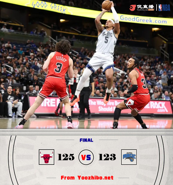 JRS低调看直播讯北京时间3月7日讯 NBA常规赛,魔术主场迎战公牛。魔术4连败,以29胜34负排东部第8,公牛24胜38负东部第10。上半场,两队开场便陷入缠斗,比分始终紧咬,魔术轮番冲击内线屡屡暴扣,公牛多点开花给出回应,次节双方继续对攻,公牛全民皆兵,班凯罗连造杀伤还以颜色,半场战罢公牛69-66领先魔术3分。下半场,魔术轰出17-4一度取得两位数领先,公牛多点开花扳平比分,末节双方争夺陷入白热化,关键时刻怀特内外开花连得5分,班凯罗绝杀三分不中,公牛125-123魔术险胜过关。