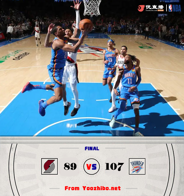 JRS低调看直播讯北京时间3月8日讯 NBA常规赛,雷霆对阵开拓者,雷霆最近5连胜依旧在西部遥遥领先,本场比赛亚历山大、杰伦威和霍姆格伦都缺阵,开拓者上场比赛遭遇失利,还是排在西部第十二。开场后雷霆外线手感不错频频命中三分,在第一节中段他们打出攻势取得领先,随后开拓者也用三分回击缩小分差。第二节上来西蒙斯率先发力带领开拓者反超比分,雷霆通过加强防守多次造成开拓者失误打出反击,并且外线续上火力重新夺回领先,第二节尾声开拓者陷入得分荒,半场过后雷霆领先到18分。易边再战,雷霆上来延续攻势将分差拉大到20分开外,亨德森突然爆发带领开拓者一路追到只差5分。第四节雷霆及时稳住局面,两队围绕10分拉锯,开拓始终无法追上比分,最终雷霆107-89击败开拓者取得6连胜,开拓者遭遇2连败。