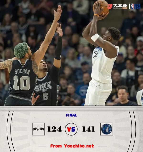 JRS低调看直播讯北京时间3月10日讯 NBA常规赛,森林狼主场迎战马刺。森林狼4连胜后36胜29负西部第7,马刺则是26胜35负西部第13。本场比赛,戈贝尔迎来复出。比赛开始,马刺开场慢热,麦克丹尼尔斯帮助球队打出不错开局,福克斯和瓦塞尔内外线接连止血回应,爱德华兹接连三分命中单节上双,森林狼首节领先8分,次节双方展开对攻战,康利连续三分命中,卡斯尔接连突破回应,里德和福克斯也在外线对飚,双方次节打成31平。下半场,双方继续对攻,马刺多点开花追分,爱德华兹接连突破回应,分差始终保持在10分左右,末段森林狼连续3记三分拉开15分领先,末节森林狼继续发力,戈贝尔接连内线吃饼拉开20分以上领先,随后双方逐渐换上替补练兵,最终森林狼141-124击退马刺,拿到5连胜。