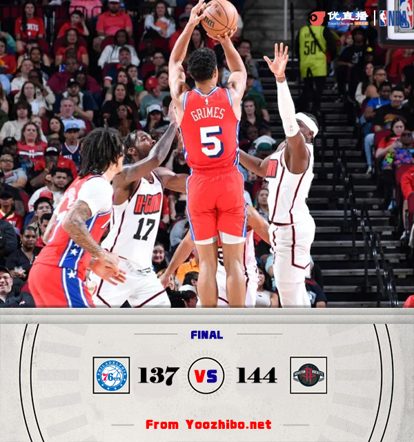JRS低调看直播讯北京时间3月18日讯 NBA常规赛今日继续开打,火箭今日坐镇主场迎战76人,76人伤兵满营本场多达11人受伤缺席比赛。首节对决双方状态都出人意料,防守效率联盟高居第二的火箭首节被伤兵满营的76人轰下44分,进攻端杰伦-格林和狄龙首节合计14中1直接导致落后16分;次节火箭防守端依旧无法阻止对手,76人半场轰进15记三分,命中率超过60%并带着21分领先进入下半场。休息归来杰伦-格林回暖主导进攻,他单节拿下10分的同时送出7次助攻,火箭在第三节以惊人的73.9%命中率狂轰45分并单节抹掉最多25分劣势。末节76人在格莱姆斯的带领下送上10-0的攻势重新确立起领先,火箭无奈再度换上杰伦-格林并稳住局面紧追比分,不过火箭场面惨烈伊森6犯离场外加范弗利特二级恶犯被驱逐,不过被雪藏整个下半场的申京最后补篮自我救赎拖入加时。加时赛申京一扫阴霾上来打成2+1,随后杰伦-格林和小史密斯外线轰进三分确立起主动,格莱姆斯的两记三分为76人咬住比分,不过火箭最后顶住压力守住优势。最终,火箭在最多落后25分的情况下上演极限逆转加时力克76人取得7连胜。