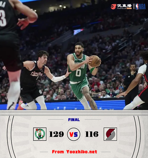 JRS低调看直播讯北京时间3月24日讯 NBA常规赛,开拓者主场迎战凯尔特人。两队都是4连胜,开拓者32胜39负西部第12,凯尔特人51胜19负东部第2。本场比赛,杰伦-布朗继续缺阵,霍勒迪和波尔津吉斯也不打。比赛开始,普理查德上来连续被吹犯规很快3犯下场,双方外线连续对飙,凯尔特人更胜一筹,塔图姆接连送助攻带队首节领先10分,次节开拓者发力连续反击一波12-0直接追平比分,霍福德接连中远投止血,绿军回应9-0稳住领先优势,随后凯尔特人外线继续发炮半场领先13分。第三节,塔图姆开始发力,里突外投单节轰下18分,凯尔特人一度拉开近20分领先,但顽强的开拓者还是追到差12分,末节双方继续对攻战,外线你来我往,但凯尔特人始终保持十几分领先,最终凯尔特人129-116力克开拓者,拿到5连胜同时终结对手4连胜。