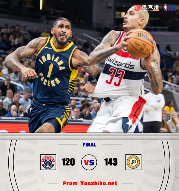 JRS低调看直播10月26日讯 NBA常规赛,奇才客场挑战步行者。上半场,奇才率先发力占据主动,步行者连中三分迅速回应,奇才持续发力打出12-3的攻击波,步行者多点开花还以颜色,次节步行者利用防守反击完成反超,布鲁斯-布朗和希尔德相继飙中三分,半场战罢步行者73-68领先奇才。易边再战,奇才命中率骤降,步行者稳扎稳打不断扩大领先,末节奇才仍无起色,步行者持续发力将分差拉开到20分以上,在还剩半节多的时间里奇才换下主力投子认负,最终,步行者主场143-120大胜奇才。