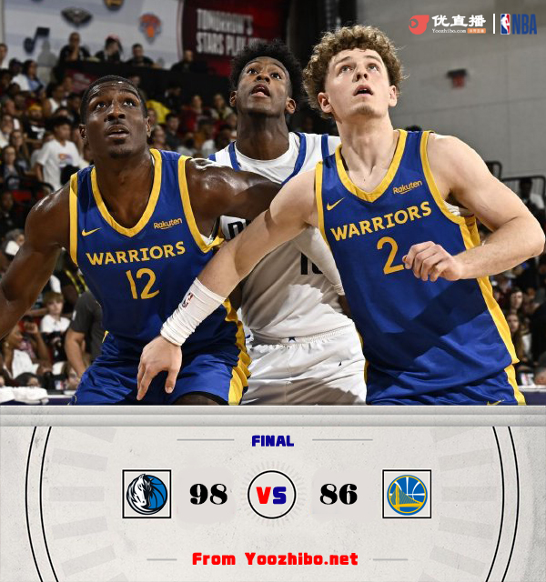 JRS低调看直播讯 7月13日 NBA夏季联赛继续开打,勇士和独行侠迎来一场交手,勇士方面阵容核心以首轮19号秀波杰姆斯基为主;独行侠方面则是二年级生哈迪加上今年12号新秀莱夫利为核心出战。首节之争两队状态相当多次交替领先,独行侠在最后一分钟里抓住勇士熄火的机会并由沃克命中三分拿到主动权;次节勇士凭借基诺内斯的连续拿分短暂反超比分;不过哈迪在进攻端状态不错,他在这一节连拿8分帮助球队守住6分优势进入下半场。休息归来场面依旧,独行侠虽然一度拿到9分优势但也无法接管比赛,勇士这边基诺内斯状态出色连拿10分,勇士用一波19-10的攻势迅速抹平比分。末节开局独行侠开局连续两次打成2+1后又在外线命中三分,他们送出15-5的攻势建立起两位数领先;这之后勇士疯狂反扑,最后时刻他们制造一记恶意犯规一个回合拿下4分,最后戴维斯命中三分扳平比分将比赛拖入加时。加时赛规则为任意一方率先拿到7分为胜者,双方一路交替拿分都拿到了6分后的赛点,最后独行侠凭借布拉克斯顿-基的补扣实现绝杀。最终,独行侠98-96险胜勇士拿下比赛,同时也送勇士三连败。