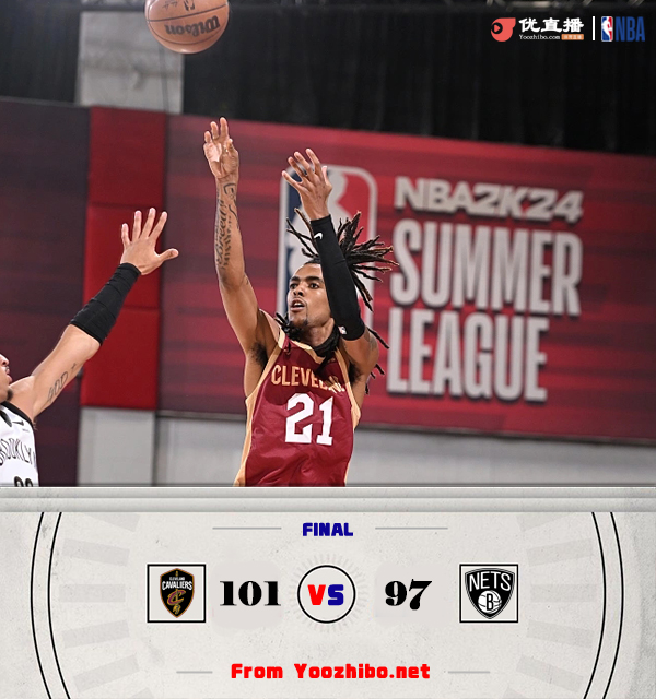 JRS低调看直播讯 7月8日 NBA拉斯维加斯夏季联赛开打,骑士首战面对篮网,骑士这边大莫布里领衔出战,篮网阵中,二年级生大卫-杜克和今年的21号秀诺厄-克洛尼在列。比赛开始后双方火热对攻,杜克先声夺人,大莫布里联手贝茨强势回应,末段篮网进攻突然断电,骑士内外开花狂轰19-2攻击波,首节结束时骑士确立11分优势,次节回来,沙里夫-库珀手感滚烫单节独得14分,篮网进攻逐渐复苏,阿尔莫尼-布鲁克斯率队回应,比分没有被进一步拉开,半场战罢,骑士依然领先14分。易边再战后场上形势风云突变,篮网一波17-3抹平分差,克雷格-波特上篮短暂止血,但篮网再次打出9-2小高潮一举反超,三节结束后篮网反超4分,末节决战,贝茨连中三分率队追分,梅里尔打成3+1后骑士再度反超,决胜时刻库珀连续取分,布鲁克斯三分续命无奈篮网追分未果,最终骑士101-97险胜篮网。