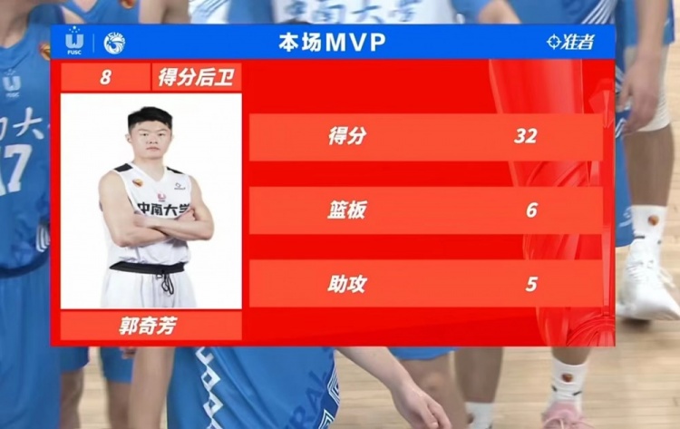 中南大学:郭奇芳32分6板5助,付永康17分6板,张东旭13分,赵中兴10分13板,龚思成17分6板7助4断