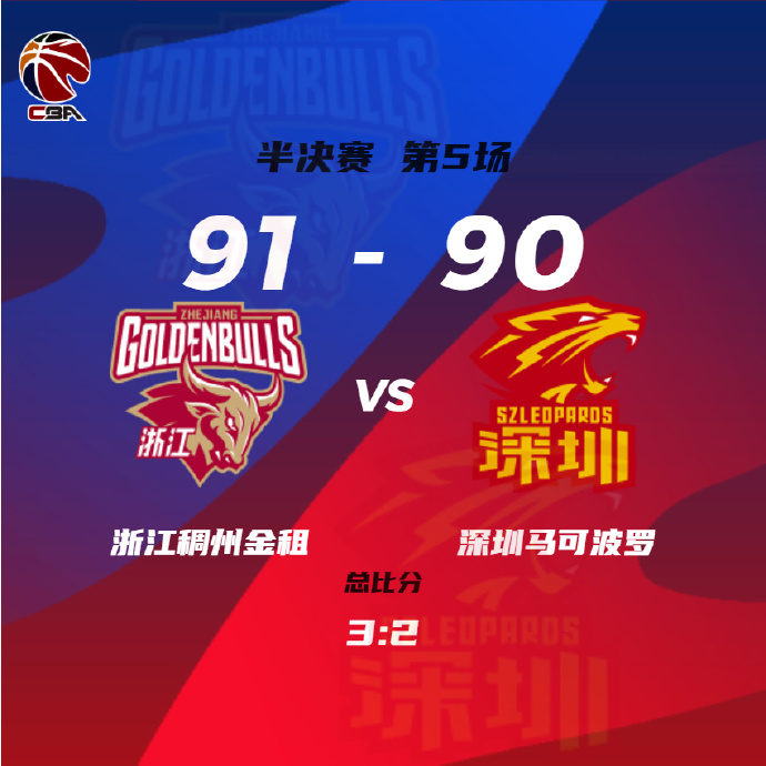 JRS低调看直播5月4日讯 CBA季后赛半决赛,浙江回到主场迎战深圳,两队上一场比赛上演精彩的绝杀与反绝杀,依靠程帅澎压哨三分的绝命一击,浙江涉险将大比分扳成2-2,将比赛拖到主场抢5。本场比赛,沈梓捷因伤缺战。双方上来状态不错,程帅澎延续上一场三分绝杀的火热状态,深圳则是靠萨林杰撑起进攻,随后全民皆兵的浙江抓住深圳接连失误打出12-0攻击波一举确立领先,但最后3分钟连续失误被深圳追分。次节双方增加防守强度,各种倒地频出,深圳一度反超比分,但很快浙江稳定情绪一波9-0稳住局势,白昊天压哨三分,深圳半场落后5分。下半场,浙江进攻端突然断电,还连续出现失误半节时间仅得2分,深圳连续反击加造杀伤打出15-0超级进攻波一举反超到近10分,吴前带领浙江开始追分,末节浙江一波15-4攻击波又反超回来,双方展开拉锯战,萨林杰关键三分再次反超1分,程帅澎空切上篮给出回应,贺希宁三分绝杀不中,最终浙江91-90险胜深圳,大比分3-2晋级总决赛。
