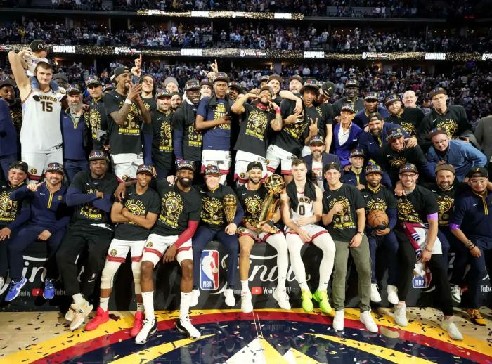 今年季后赛,掘金首轮4-1淘汰森林狼,西部半决赛4-2击败太阳,西决4-0横扫湖人,总决赛4-1淘汰热火从而夺得队史首冠,夺冠后掘金全队在更衣室疯狂庆祝,狂喷香槟以及猛抽雪茄,抱着总冠军奖杯尽享胜利的喜悦,约基奇抱着穆雷跳进水池,戈登更是赤膊跑到街头和掘金球迷一起狂欢。