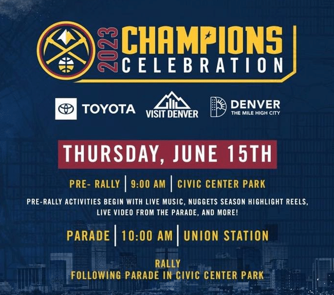 掘金将在北京时间6月16日凌晨0点举行游行典礼,在市民中心公园开始集合,从联合车站开始游行,最终抵达市政中心公园;届时掘金全队将乘坐大巴庆祝夺冠,与整座城市的球迷一起狂欢。
