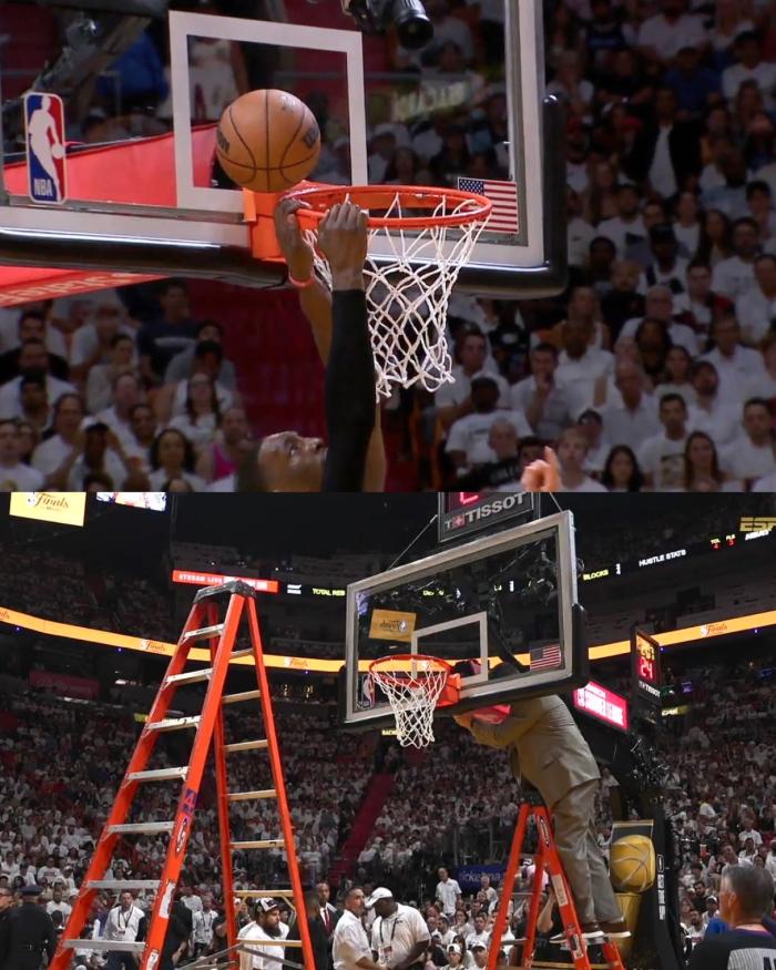 第三节还剩2分07秒,阿德巴约进攻干扰球后挂在篮筐上,拽歪了篮筐,之后256斤的约基奇双手挂在篮筐的另一侧,试图修正篮筐,可这样明显不行,热火工作人员拿着梯子和水平仪来到场上,很快就修好了篮筐,比赛大概延迟了5分钟左右。