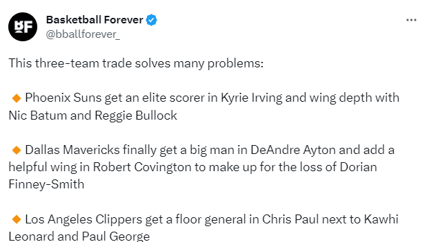 美媒表示,太阳、快船和独行侠三方交易可以解决各自的很多问题,具体的交易框架如下: