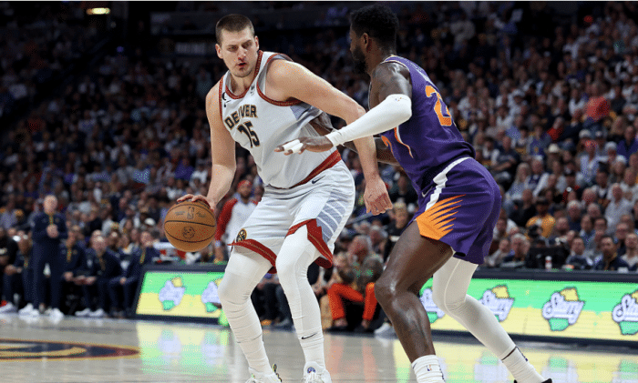 赛前,约基奇主动把球送给太阳老板,两人拥抱和解,此前G4上半场,约基奇因推倒太阳老板吃到技犯,并且被联盟追加2.5万美元的罚款。G5关键一战,掘金第一节攻防两端压制太阳,一度35-20领先多达15分,约基奇打满12分钟,单节贡献5分5篮板4助攻,带领球队首节领先11分。第二节,掘金进攻哑火,被太阳打出22-7攻势,领先优势瞬间被反超,见状,约基奇外线开炮轰进三分,带领掘金夺回主动权,半场打完掘金领先3分,约基奇10分7篮板6助攻,奔着三双去了。