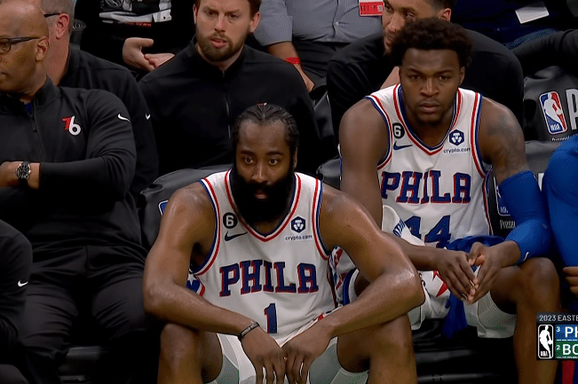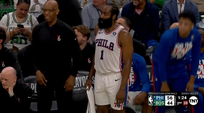 第二节,哈登强投轰进三分,之后撞开斯玛特中投得分,梅尔顿抢断后豪斯反击上篮,暂停回来哈登助攻里德上篮得分,哈登带队9-1领先到15分;之后76人被绿军打出10-0攻势,领先优势仅剩5分,哈登下场休息后恩比德上场带队,4分59秒哈登重新上场。