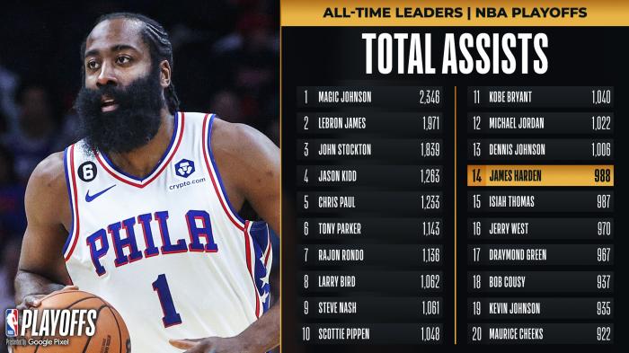 1、哈登职业生涯季后赛助攻数达到991次,超越“微笑刺客”以赛亚-托马斯独占历史第14位,哈登距离季后赛突破1000次助攻仅差9次,未来有望超越丹尼斯-约翰逊(1006次)