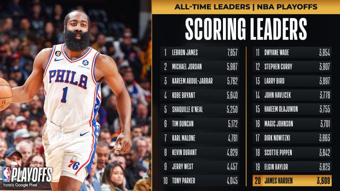 2、随着10分到手,哈登季后赛生涯总得分来到3608分,超越张伯伦(3607分),排名季后赛得分榜第20位,排在他之前的是埃尔金-贝勒(3623分),本场比赛有望超越贝勒提升历史排名。