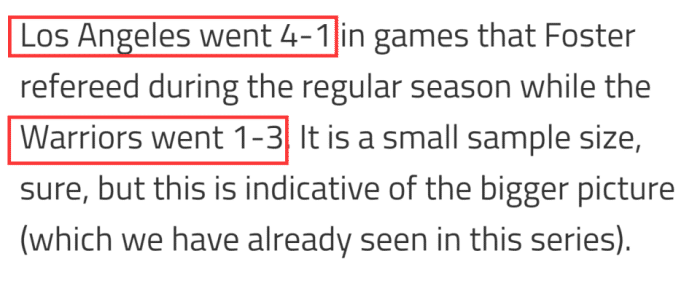 前NBA球星皮尔斯曾说过,福斯特是最快让抱怨的球员吃技犯的裁判。湖人是本赛季罚球次数最多的球队,再考虑到福斯特吹湖人的战绩,美媒认为湖人球迷应该是可以接受的。福斯特生涯执哨湖人120场,湖人65胜55负,胜率54.2%;执哨勇士122场,勇士60胜62负,胜率49.2%。