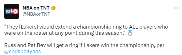 来源:JRS低调看直播05-09 09:48JRS低调看直播05月09日,据名记Chris Haynes报道,湖人总经理佩林卡已经确认,若湖人本赛季夺冠,他们将为本赛季在任何时刻效力过球队的球员颁发总冠军戒指,这意味着若湖人夺冠,威少和贝弗利等湖人旧将都能收到湖人的总冠军戒指。