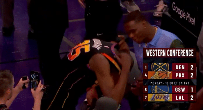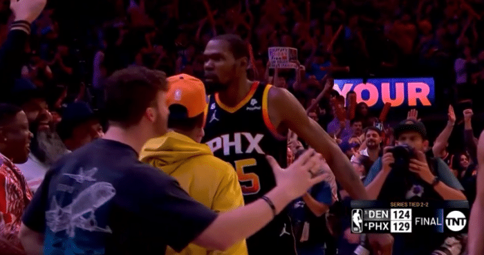 赛后,杜兰特和场边友人疯狂庆祝,露出霸气的表情,太阳老板以及全场球迷鼓掌庆祝,然后杜兰特走到底线附近,和另一个友人紧紧拥抱庆祝,然后脱掉本场所穿的球衣送给他。