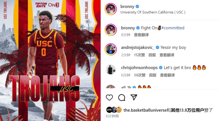 布朗尼承诺加盟南加大!最新身价740万美元:球队排名升至全国第8