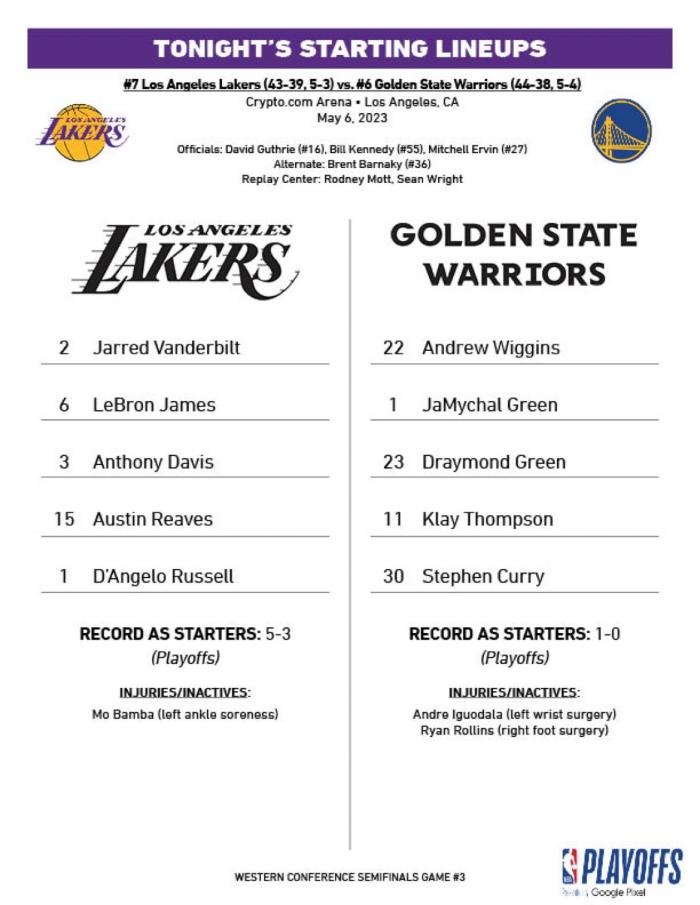来源:JRS低调看直播05-07 12:25JRS低调看直播讯05月07日,湖人和勇士系列赛G3首发出炉,两队都未变阵,詹姆斯、浓眉、拉塞尔、里夫斯和范德比尔特继续首发,卢尼病愈仍旧替补,勇士延续G2首发。