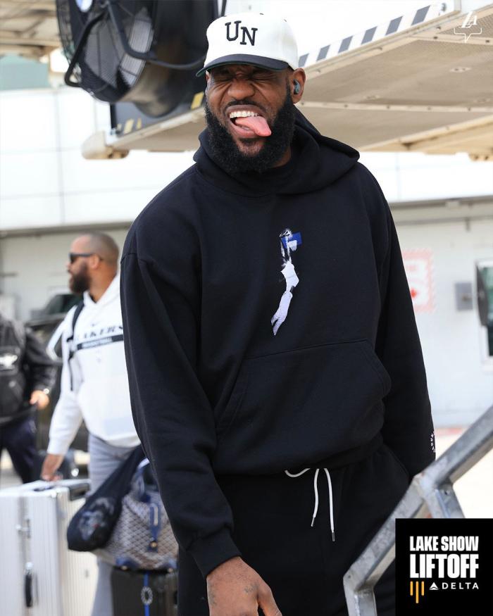 38岁詹姆斯身穿黑色连帽卫衣,戴着棒球帽和耳机,登机时露出挤眼吐舌的搞怪表情;拉塞尔身穿红色卫衣,刷着手机登上飞机,浓眉则是正在打电话,整个人的表情十分严肃,值得一提的是,浓眉穿着一件羽绒服。