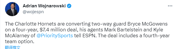 据名记Woj报道,球员经纪人透露,黄蜂双向合同后卫布莱斯-麦戈文斯将以一份4年740万美元的合同转正,且第四年为球队选项。