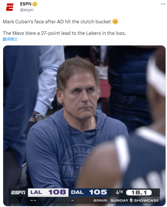 欧文错失超远续命三分后十分落寞,对于被逆转,库班脸色铁青太难受;湖人赢球,詹姆斯拥抱里夫斯、浓眉等队友庆祝胜利,詹眉拥抱前队友麦基开怀大笑,另外詹姆斯开心拥抱东契奇和欧文,他们都满脸笑容十分开心,尤其是詹欧拥抱,老詹十分兴奋。