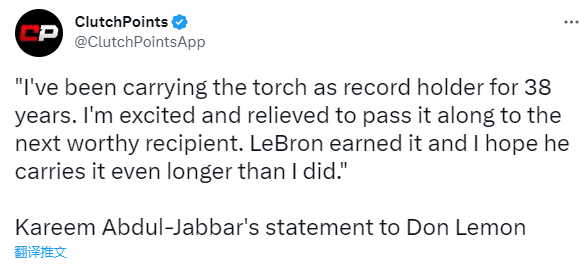对于詹姆斯即将加冕历史得分王,“天勾”贾巴尔发表一份声明,表示:38年来,我一直作为纪录保持者在传递火炬,我很高兴也很欣慰能将它传递给下一个值得的人,勒布朗值得这个,我希望他传递的时间比我久。