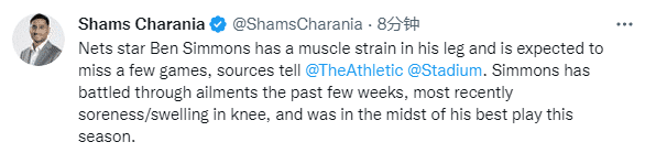 据名记shams报道,篮网球星本-西蒙斯腿部肌肉拉伤,预计将缺席几场比赛。过去几周,西蒙斯一直在与疾病作斗争,最近一次是膝盖酸痛/肿胀,他正处于本赛季的最佳状态。