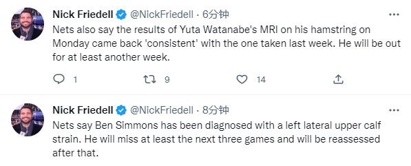 篮网官方表示,本-西蒙斯的伤情被确诊为左侧小腿上部肌肉拉伤,预计他将至少缺席未来三场比赛;渡边雄太接受了核磁共振检查,结果与之前的检查一致,因腿筋拉伤至少再伤停一周,他将继续接受治疗。