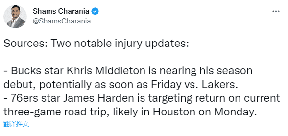 shams报道,雄鹿球星米德尔顿即将迎来赛季首秀,最快可能在周六雄鹿主场对阵湖人的比赛中复出。