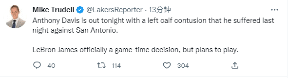 来源:JRS低调看直播11-27 10:30JRS低调看直播11月27日,湖人背靠背对阵马刺赛前,湖人队更新伤情,据湖人记者Mike Trudell报道,詹姆斯将会继续出战,浓眉则因新伤(左小腿挫伤)而缺席比赛。