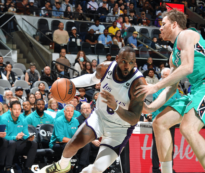 下半场,湖人第三节进攻哑火还失误不断,单节20-34净输14分,被马刺打回悬念,不过末节詹姆斯和浓眉早早上场,詹眉多次连线,詹姆斯更是持球反击滑翔暴扣,湖人稳住局面,比赛还剩1分37秒,詹姆斯、浓眉提前下场休息,最终湖人拿下胜利。