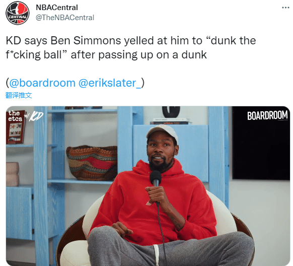 谈到西蒙斯最近在场上的心态有了很大的变化,杜兰特透露:在之前对阵开拓者的比赛中,我溜底线接到了西蒙斯的传球,但我选择把球传给了底角的乔-哈里斯,在他三分不中后,本西跟我说‘你该把那个该死的球扣进去!’。我说,‘好吧,我的错’。