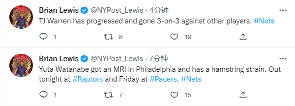 来源:JRS低调看直播11-24 16:01JRS低调看直播11月24日,篮网队的最新伤情曝光,据篮网记者Brain lewis报道,渡边雄太的核磁检查结果显示,他的腿筋拉伤,因伤至少再缺席2场比赛;篮网新援TJ-沃伦已经参加三对三比赛,
