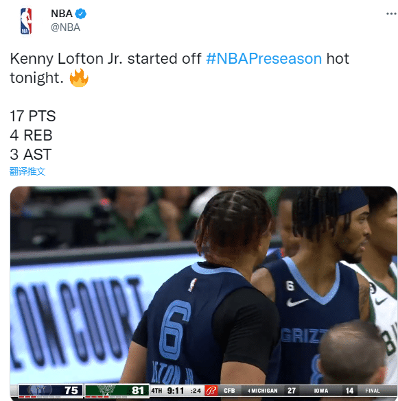 灰熊逆转雄鹿赛后,NBA官方晒出洛夫顿本场比赛的集锦,配文写道:洛夫顿今晚很火爆;值得一提的是,末节关键时刻,洛夫顿再次打成2+1时,站在场边吃零食的字母哥直摇头。