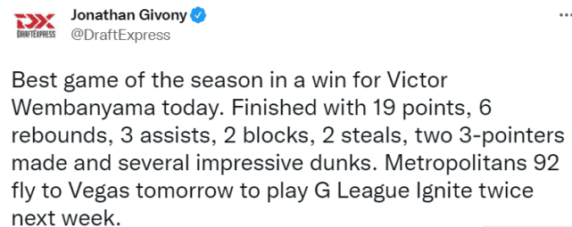 来源:JRS低调看直播10-01 11:30JRS低调看直播10月01日讯 ,在最新结束的一场法甲比赛中,文班亚马出战32分钟,得到19分6篮板3助攻2盖帽2抢断,帮助球队92-82获胜。选秀专家Givony评价道:“这是文班亚马本赛季至今打得最好的一场比赛。他投进了两个三分球,还有一些令人印象深刻的扣篮。”文班亚马明日将随队飞往拉斯维加斯,下周他将和G联赛的点燃队交锋两次,PK另一位状元热门亨德森。