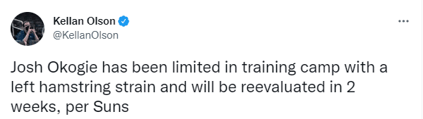 来源:JRS低调看直播10-01 10:24JRS低调看直播10月01日讯 ,新赛季还没正式开打,NBA又添伤员;据太阳随队记者Kellan Olson报道,球队后卫奥科吉遭遇左腿筋拉伤,将在两周后重新进行评估;换言之;太阳新援奥科吉至少伤停2周,这说明受伤程度至少是腿筋一级拉伤。