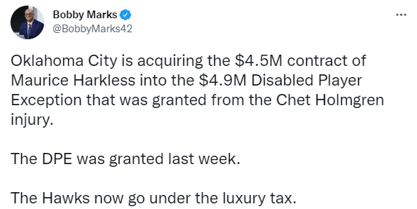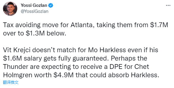 另一薪资专家Bobby Marks表示:雷霆伤病特例是上周获得的,现在老鹰要缴纳奢侈税。