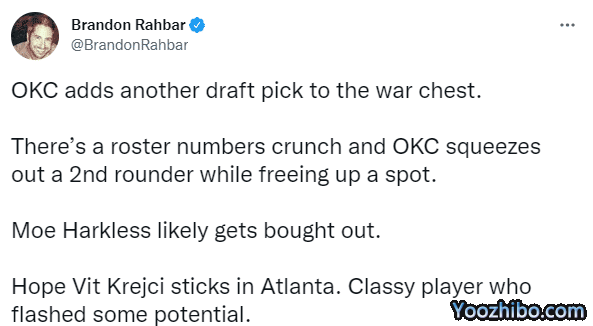 雷霆1换2又获得一个选秀权,目前雷霆未来7年拥有14个首轮签,据美记Brandon Rahbar报道,雷霆此举是为了腾出一个阵容名额;哈克利斯可能会被买断,预计他很快会成为自由球员,希望克雷伊奇能在亚特兰大打出他的价值。
