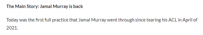 据掘金随队记者Ryan Blackburn报道,球队后卫贾马尔-穆雷全面参与训练,这是他自2021年4月份遭遇前交叉韧带撕裂以来首次参加全队训练。