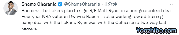 来源:JRS低调看直播09-26 15:29JRS低调看直播09月26日,湖人官方裁掉一人后连续签下两名球员,据名记Shams报道,湖人计划以非保障合同签下马特-瑞安,还用训练营合同签德维恩-培根;湖人20人大名单满额,三巨头领衔冲冠。