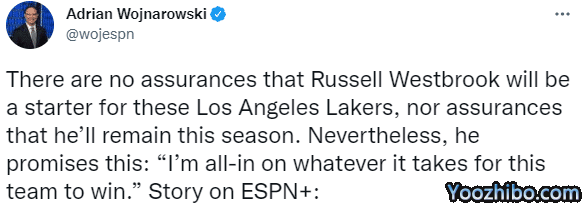 来源:JRS低调看直播09-26 11:13JRS低调看直播09月25日,ESPN名记沃纳罗斯基撰文报道,即使没有获得留队保证和首发保证,威少仍旧表示:我会全力以赴帮助湖人获胜;这就是深陷交易流言之中时,威少的心态,甘愿担任任何角色,仍相信湖人三巨头不可阻挡。